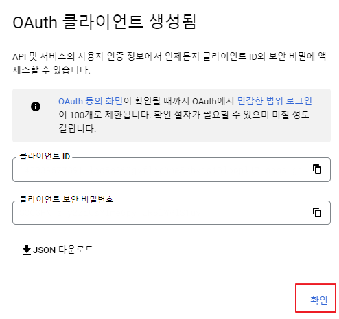 21. 확인 버튼 클릭 및 생성된 OAuth 클라이언트 ID에서 다운로드 클릭