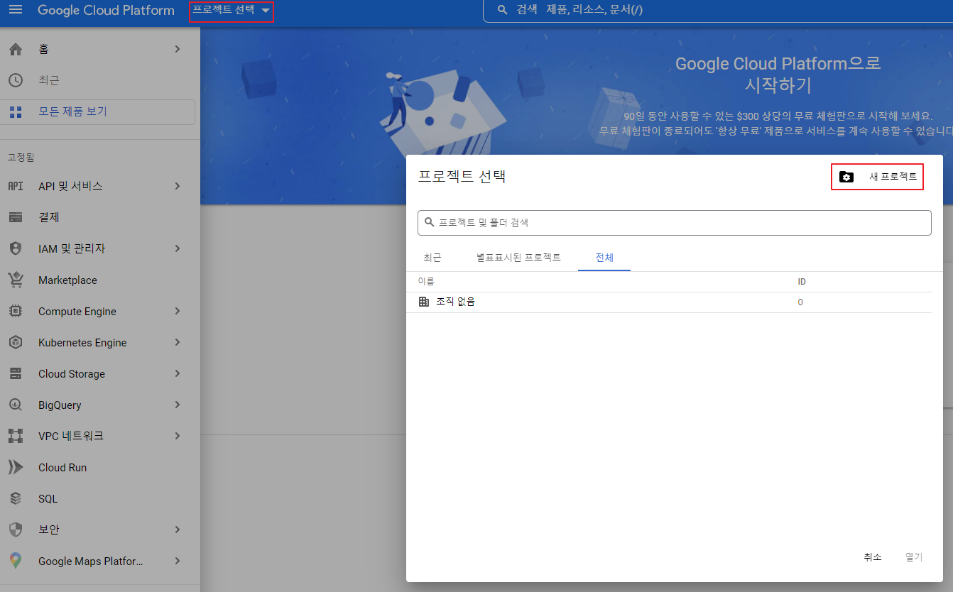 6. 왼쪽 상단 프로젝트 선택 클릭 및 새 프로젝트 클릭