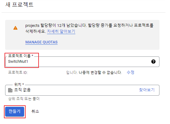 7. 임의의 프로젝트 이름 설정 및 만들기 버튼 클릭